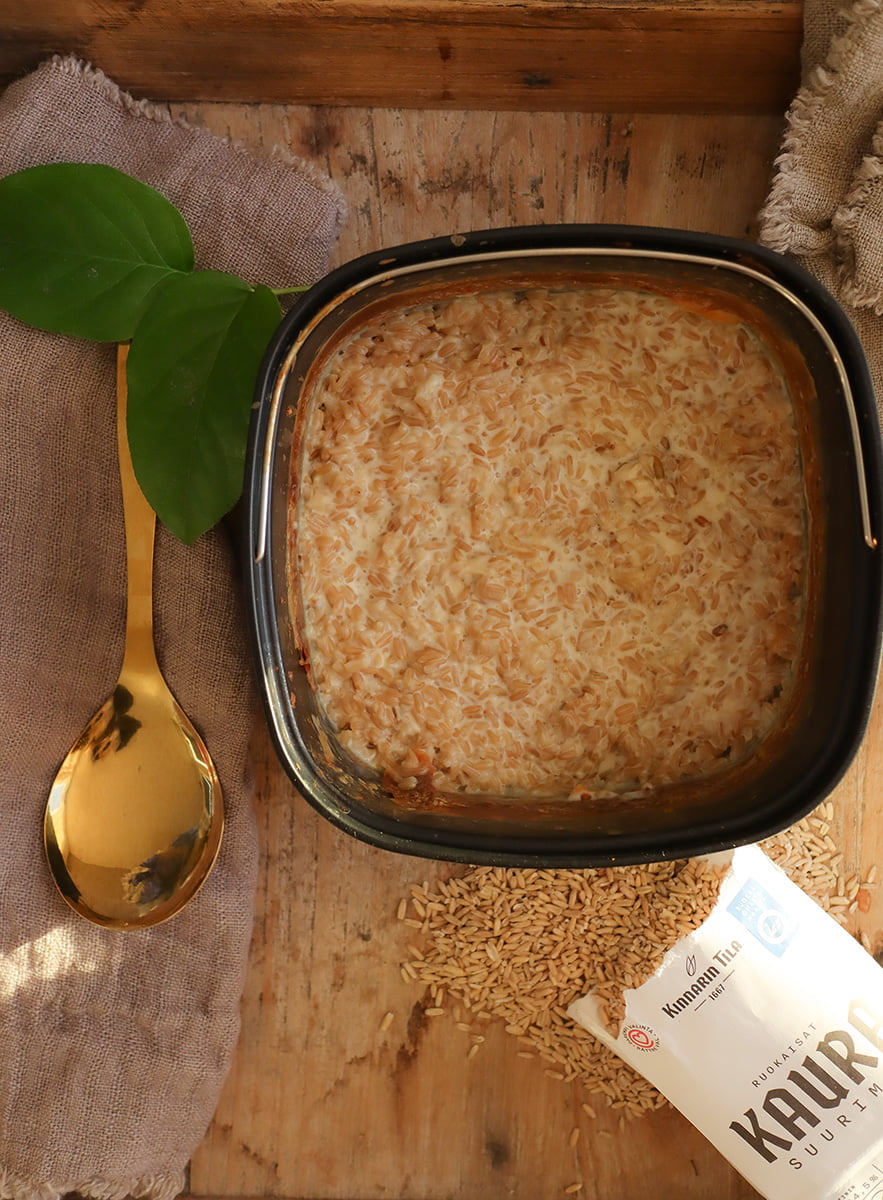 Kaurasuurimopuuro valmistuu Airfryerissa noin tunnissa. Eli reilusti nopeammin ja vähemmissä asteissa mitä perinteisesti uunissa.