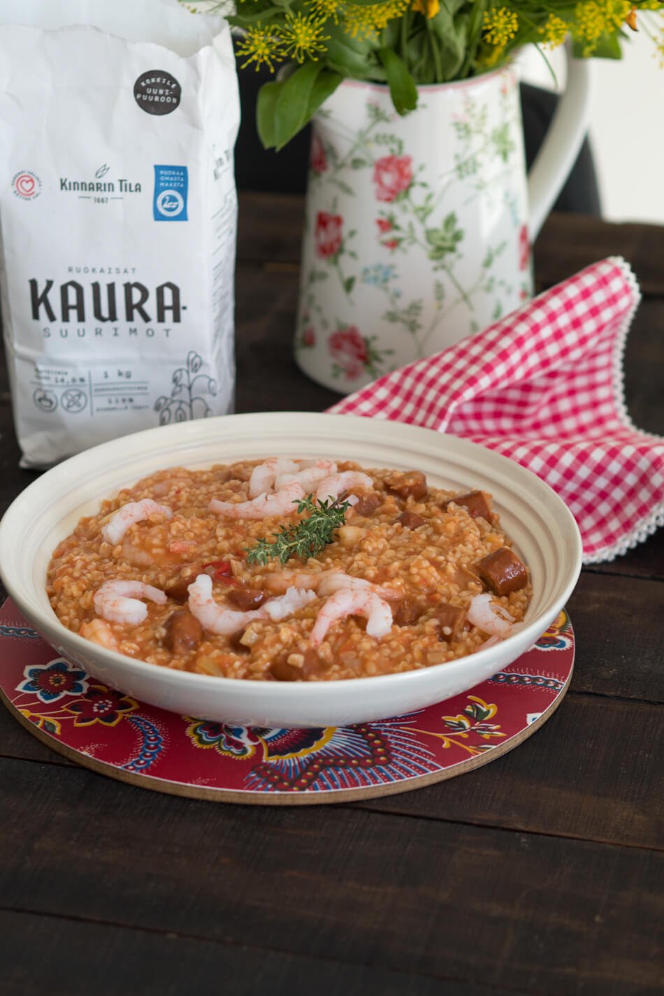 Jambalaya on louisianalaisen keittiön tulisempi vastine espanjalaiselle paellalle. Tässä kauraissassa versiossa makua tuovat niin mausteinen chorizo kuin mehevät katkaravut.