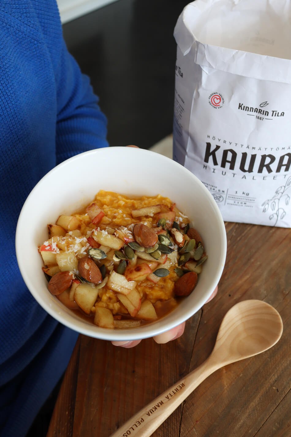Todellinen herkkupuuro kaikilla lisukkeilla. Upea omenakompotti, siemenet ja mantelit viimeistelevät pehmeän porkkanapuuron.