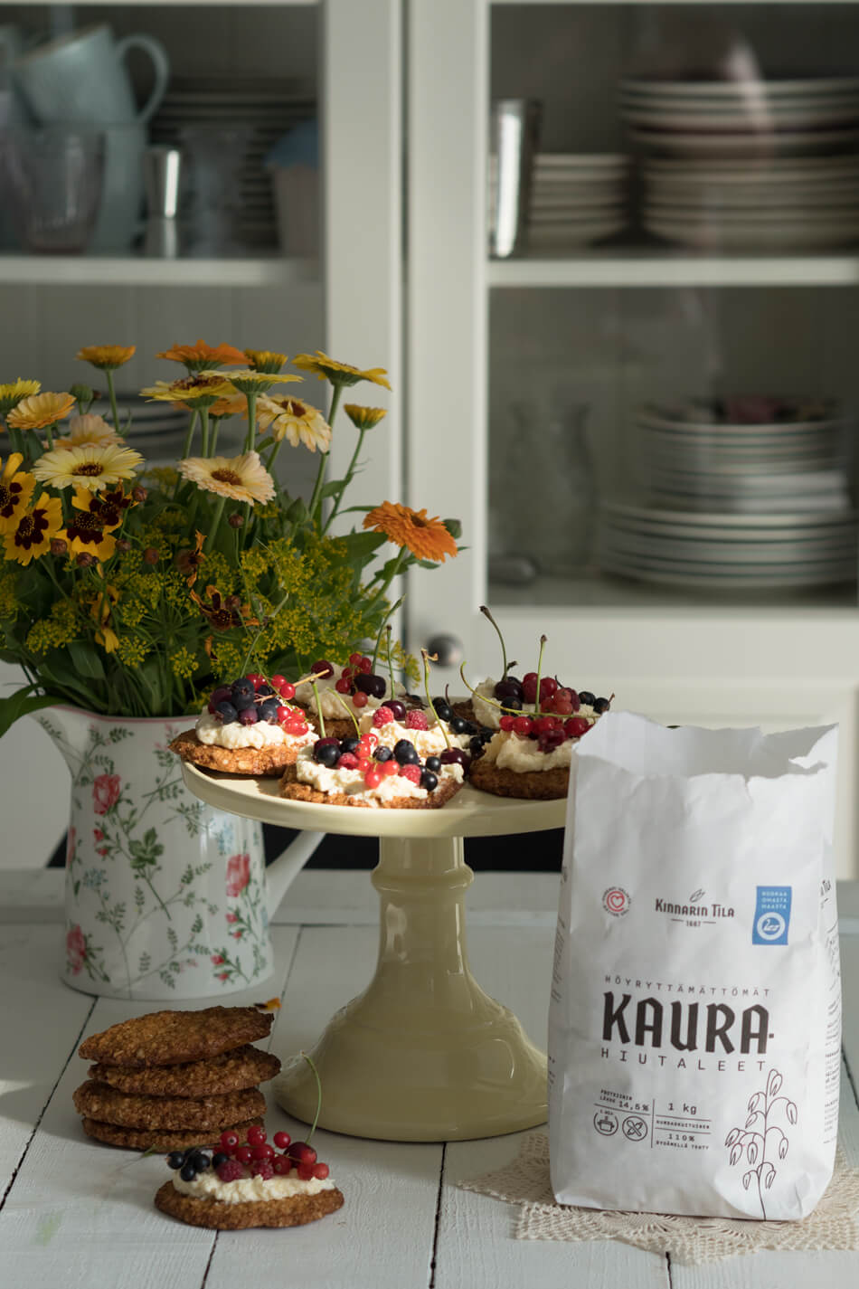 Kaurakeksipohja, päällä herkullista vaniljarahkaa ja tuoreita marjoja.
