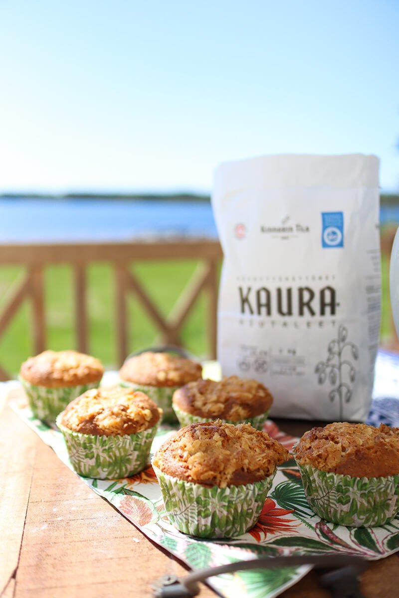 Nämä ihastuttavat muffinsit kätkevät sisälleen pehmeäksi paistetut raparperit. Voit muunnella reseptiä käyttämällä raparperien sijaan vaikkapa mustikoita, vadelmia tai omenaa.
