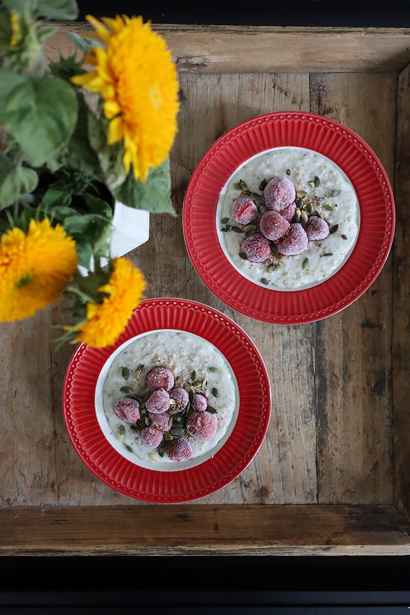 Nopeasti valmistuva, veteen keitettävä, lempeän pehmeä vaniljapuuro tarjoillaan mansikoiden ja kreikkalaisen jogurtin kera.