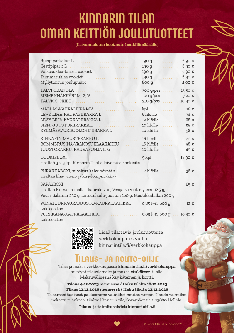 Joulun maut syntyvät kiireettä. Tilaa Kinnarin tilan joulutuotteet ennakkoon ja nouda ne valmiina pakattuina tilamyymälästämme – helposti, tuoreesti ja lähellä tehtynä.