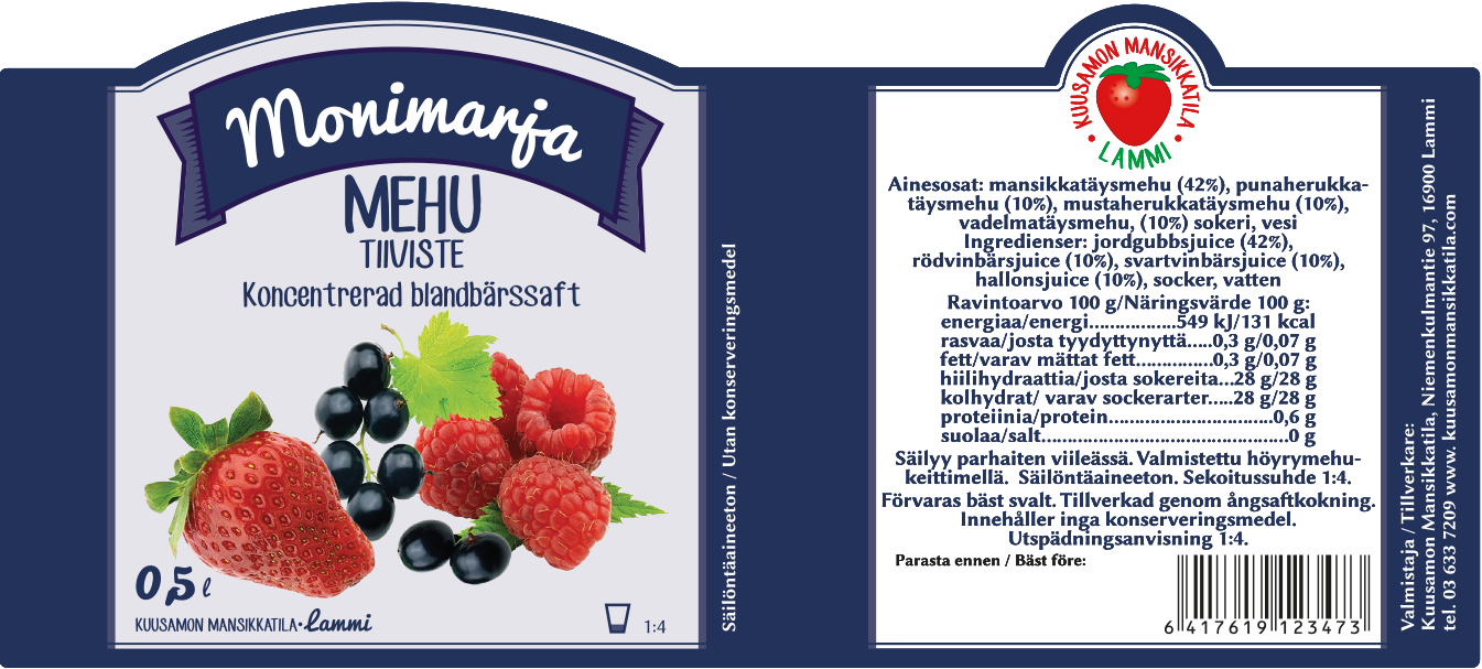 Kuusamon Mansikkatilan makoisa monimarjamehu 0,5L.