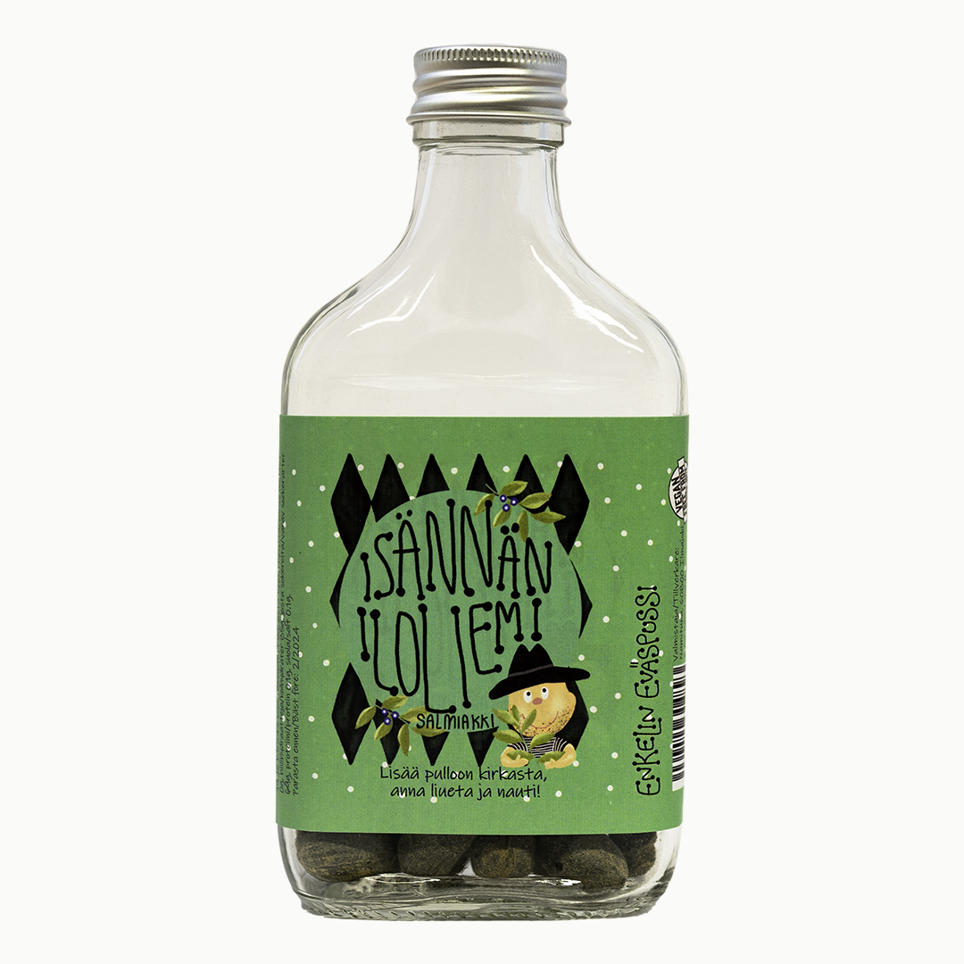 Namituvan Isännän iloliemi – salmiakkikarkkeja lasipullossa. Lisää neste pulloon, anna liueta ja nauti hyvässä seurassa!