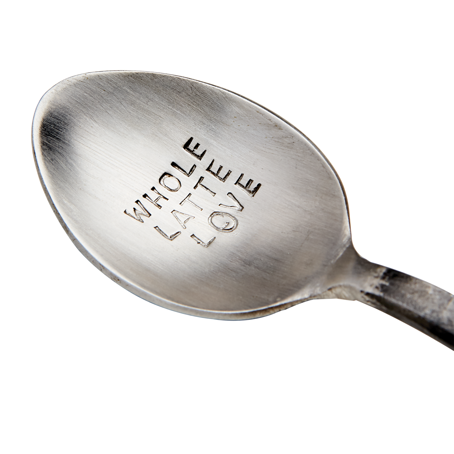 Teräksinen hopean värinen lusikka, jossa teksti whole latte love.