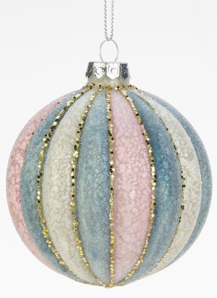 Pastellinsävyinen kimaltava lasipallo. Halkaisija 8 cm.