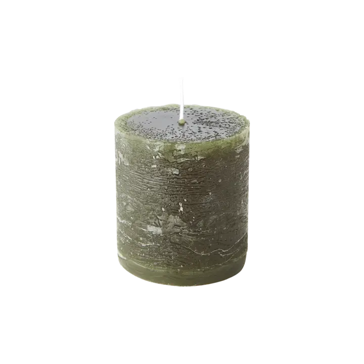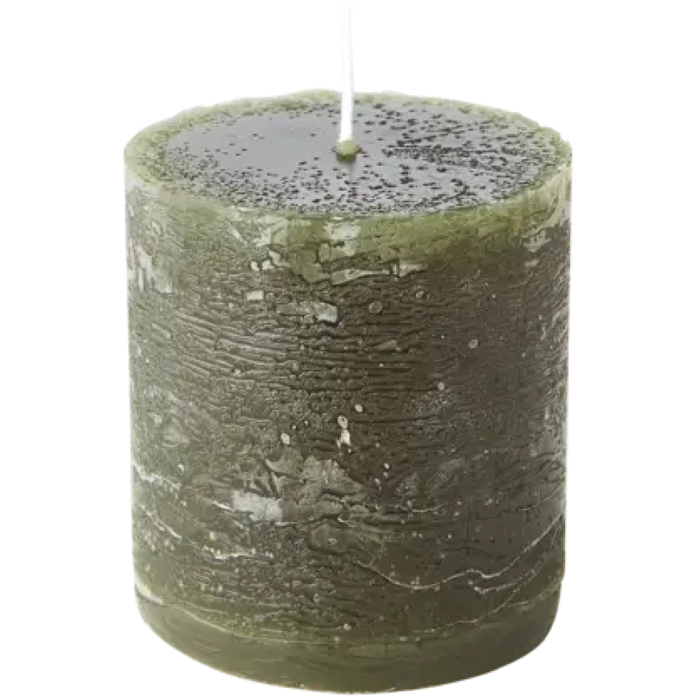 Metsänvihreä pilarikynttilä. Korkeus 7,5cm ja halkaisija 7 cm.